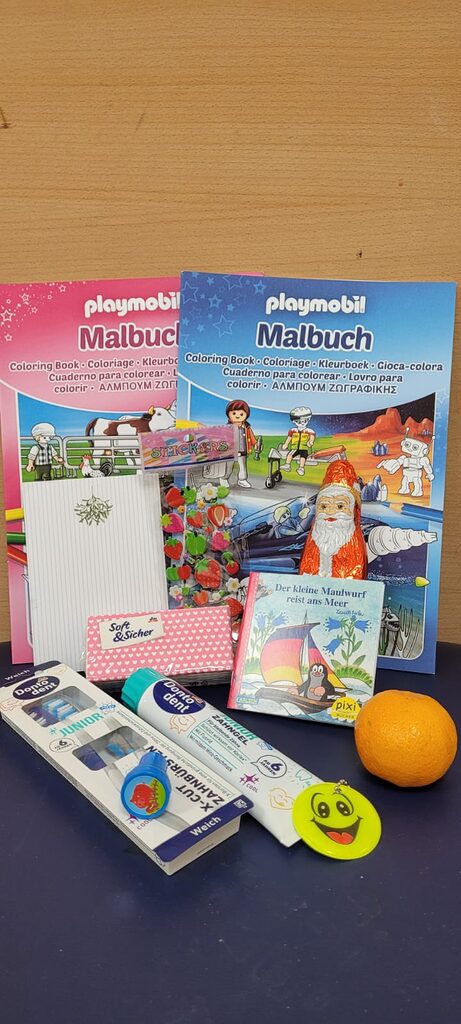 Von Malbüchern über einen Schoko-Nikolaus bis zu Stickern und Reflektoren waren allerhand nützliche und unterhaltsame Kleinigkeiten dabei. Durch Sachspenden konnten wir unsere Geschenke weiter aufstocken und den Schülerinnen und Schülern gut gefüllte Taschen überreichen. So hat uns beispielsweise das Nürnberger Unternehmen „Mit Ecken und Kanten“ mit Schreibblöcken unterstützt. Zusätzlich stellten wir den Schulklassen gespendete Stoffmalstifte zur Verfügung, mit denen die Stofftaschen nach der Nikolauszeit bunt bemalt werden. Die Kinder und Lehrerinnen waren begeistert von den Geschenken!